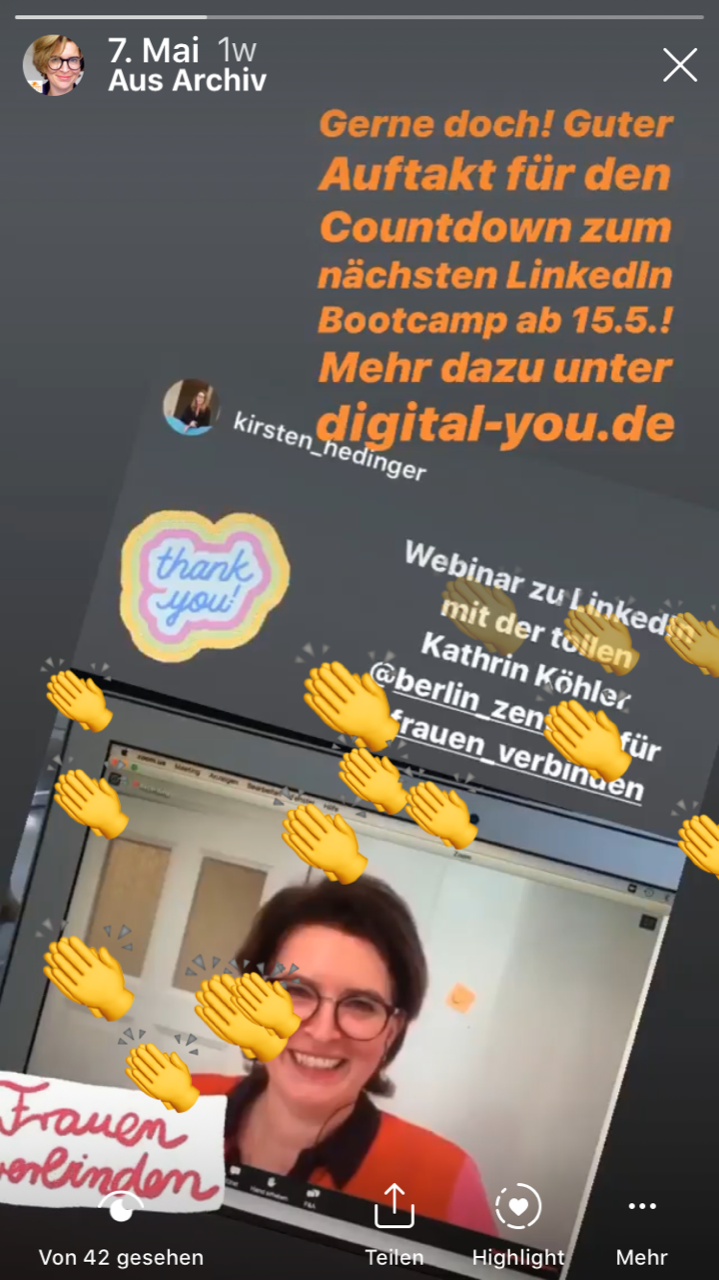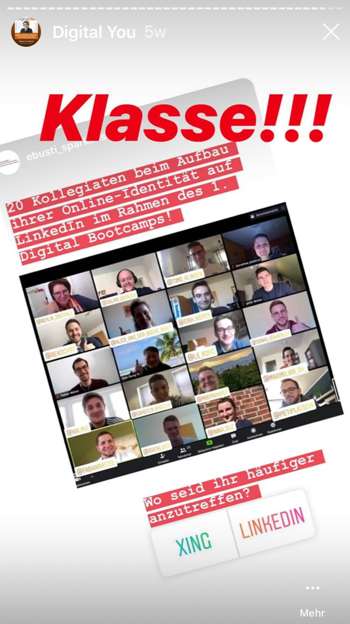 Der erste Schritt ist zumeist die Profiloptimierung – dafür bieten wir das LinkedIn Video Camp Profil Power an, mit dem jede und jeder nach eigenem Tempo arbeiten und hier sofort durchstarten kann. Dieses Video Camp ist auch grundlegender Bestandteil des Gruppenprogramms "Sprint in die Sichtbarkeit", das wir dauerhaft anbieten.