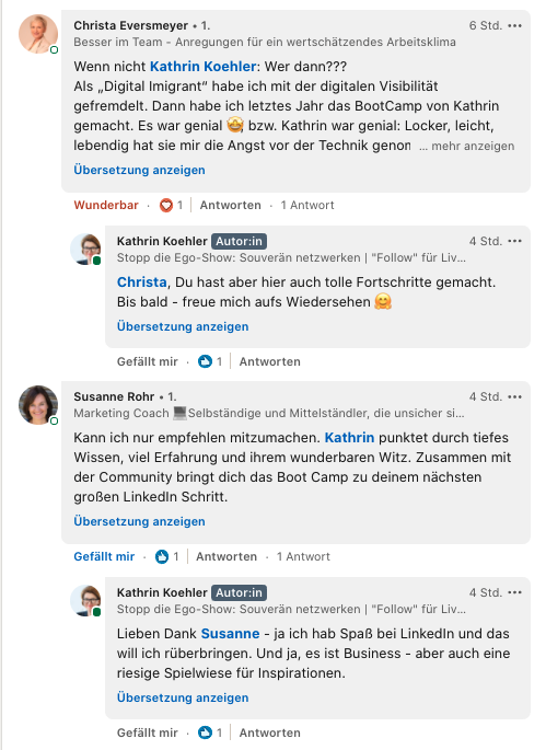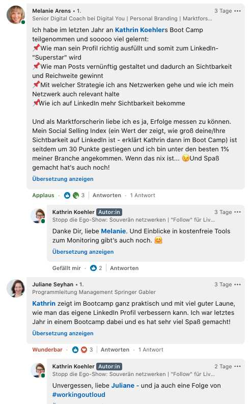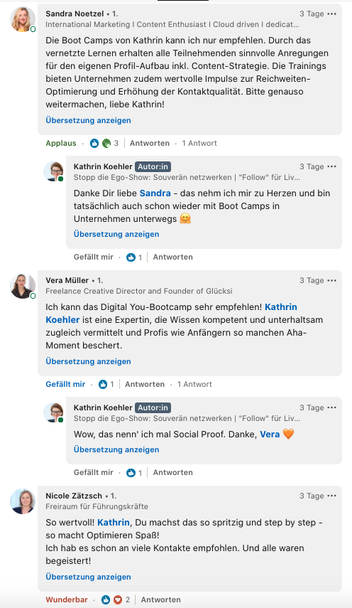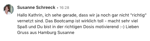 "Ich nutze LinkedIn jetzt viel intensiver als vor dem Boot Camp und bekomme über spannenden Content auch viel mehr Input. In den letzten drei Wochen habe ich mein Profil komplett überarbeitet. Und: dank erster Postings bin ich auch für andere präsenter als vorher.
