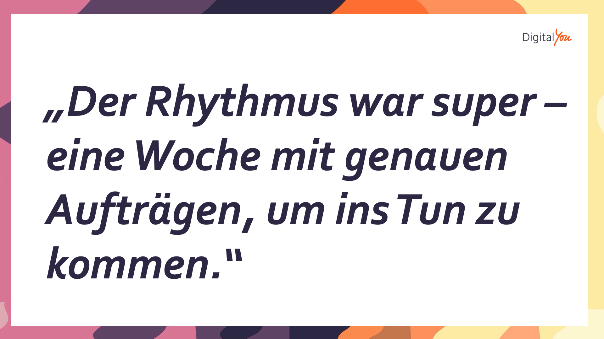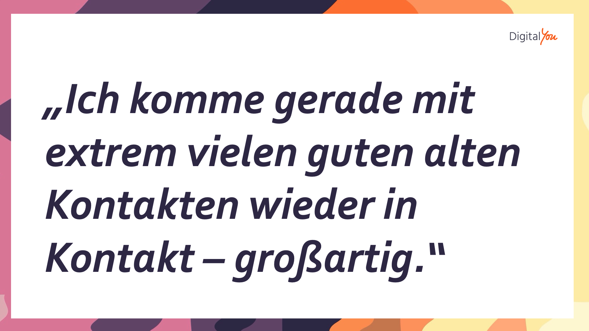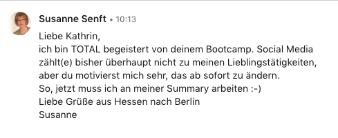 "Linkedin ist mir vertrauter geworden. Vor dem Camp fühlte ich mich in meiner Kommunikation bei Facebook oder Instagram wohler. Nun fühle ich mich auch auf dieser Plattform sicherer und bin mutiger geworden. Viele Details, die ich sonst nicht entdeckt hätte, wurden im Camp besprochen und gut verständlich vermittelt. Danke, Kathrin!"