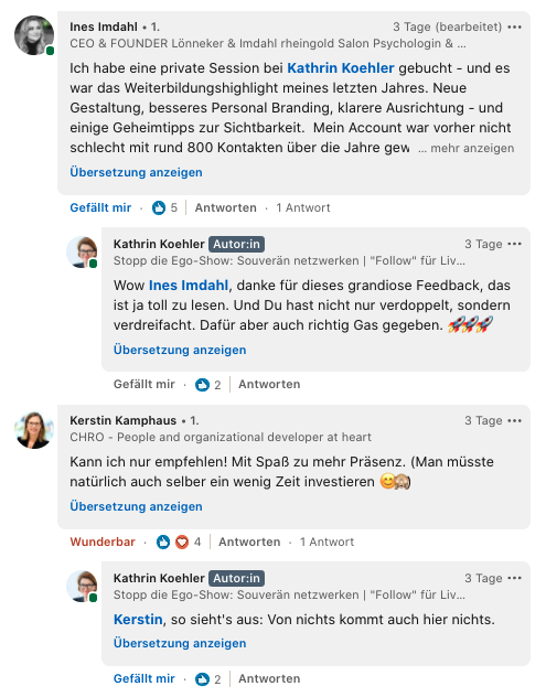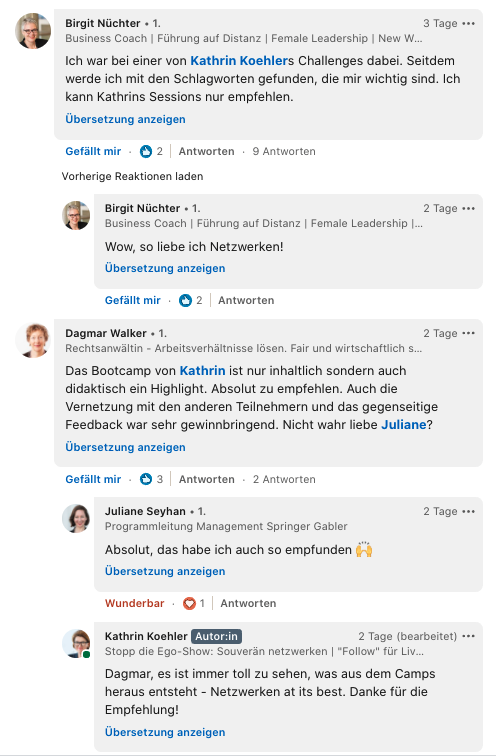 Parallel zu den Live-Terminen arbeiten wir gemeinsam in einer geschlossenen LinkedIn-Gruppe – und damit völlig zeitunabhängig. Hier kannst Du Dich gezielt zu den einzelnen Steps mit den anderen austauschen, die Plattform besser kennenlernen und Deine Fortschritte in geschütztem Rahmen sichtbar machen.