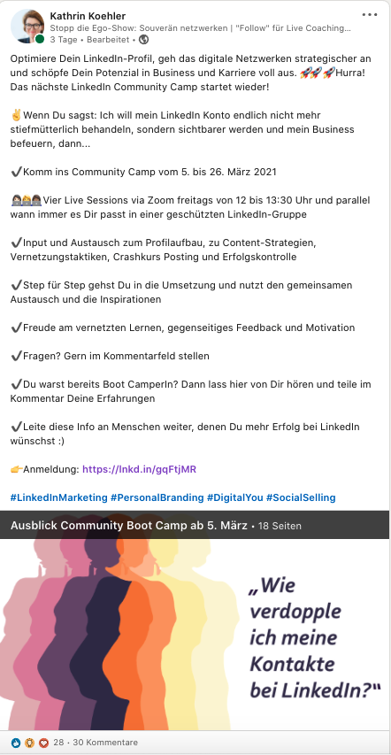 Anbei zum Hineinschnuppern Auszüge aus dem ersten Video im Group Camp #netzwerken2020. Im Januar 2020 haben hier rund 200 Interessierte in einer geschlossenen LinkedIn Gruppe ihr Profil bei LinkedIn optimiert und viel Feedback in der Gruppe erhalten.