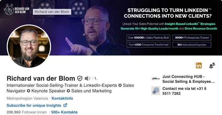 Richard van der Blom ist Europas führender B2B-Experte für den Einsatz von LinkedIn™ in großen Corporates, Organisationen und im Mittelstand. Der Gründer und CEO von Just Connecting HUB, einer international anerkannten Agentur, entwickelt wirksame LinkedIn™-Schulungen und Beratung, um die Vertriebs- und Marketingleistung zu steigern.
